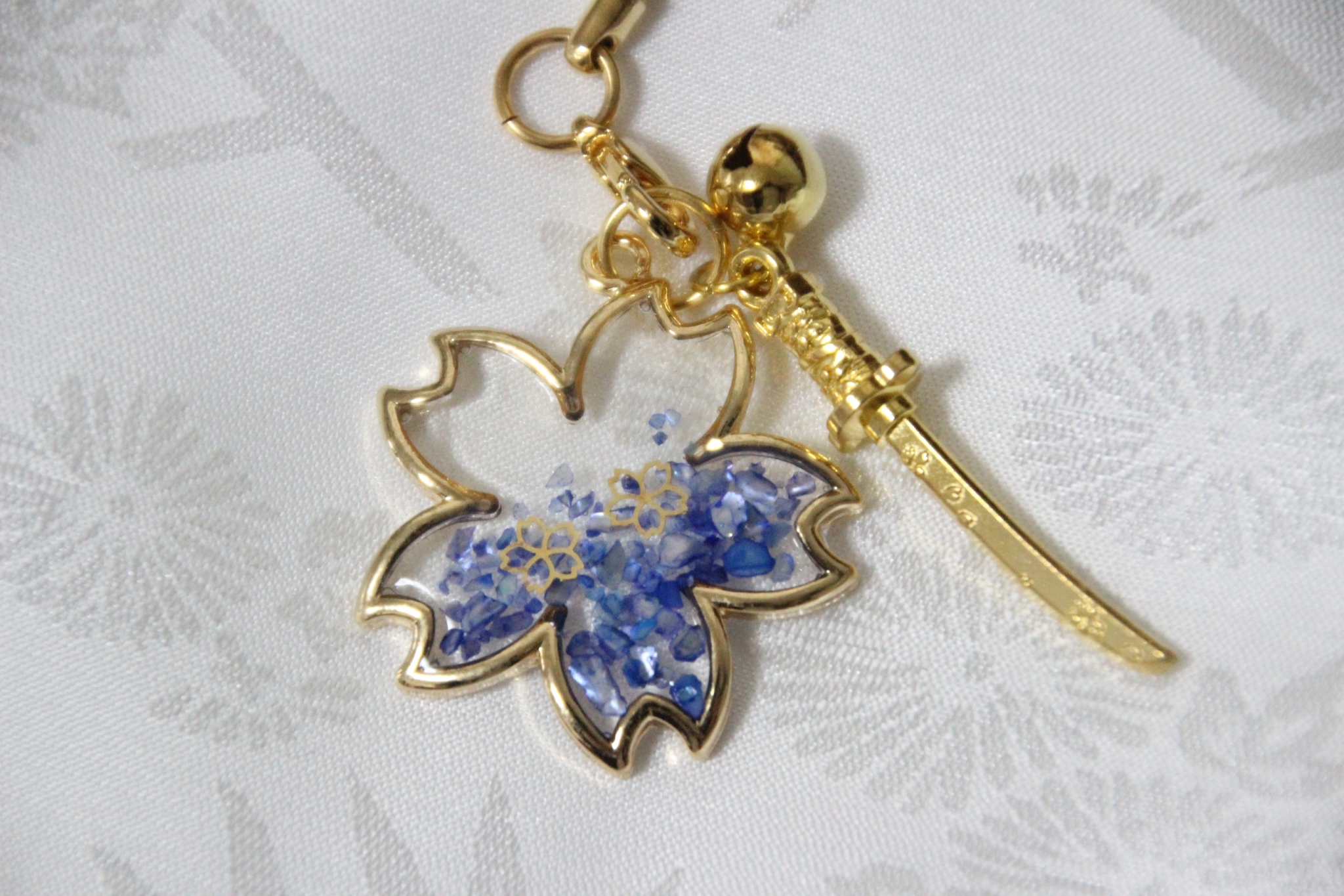 桜のフレームにカラーのシェル、誉の桜を封入し、特上の刀装に見立てた金の鈴と桜デザインの刀を添えました。