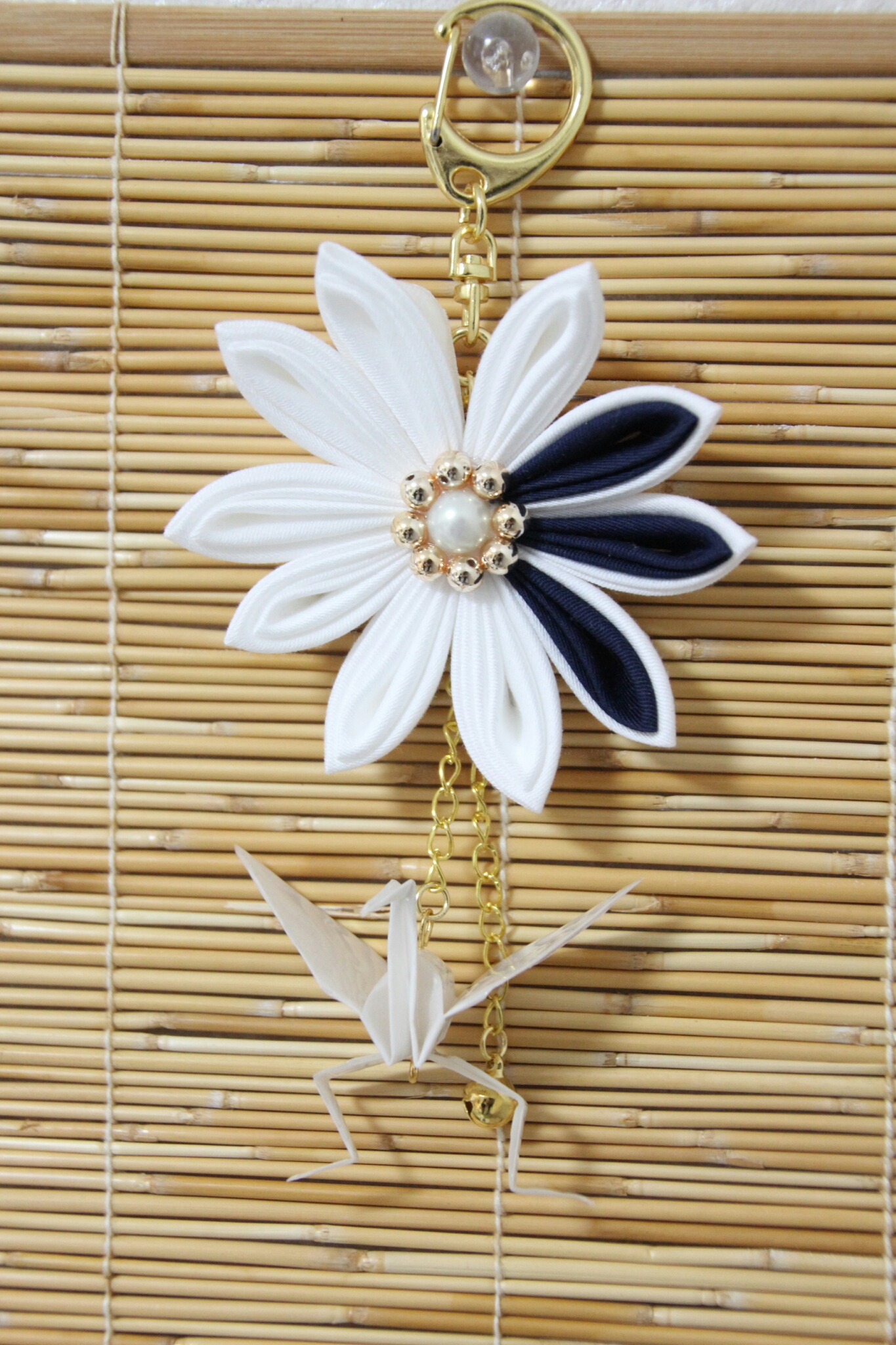 つまみ細工のお花と例によって脚の生えた鶴がついたチャームです。